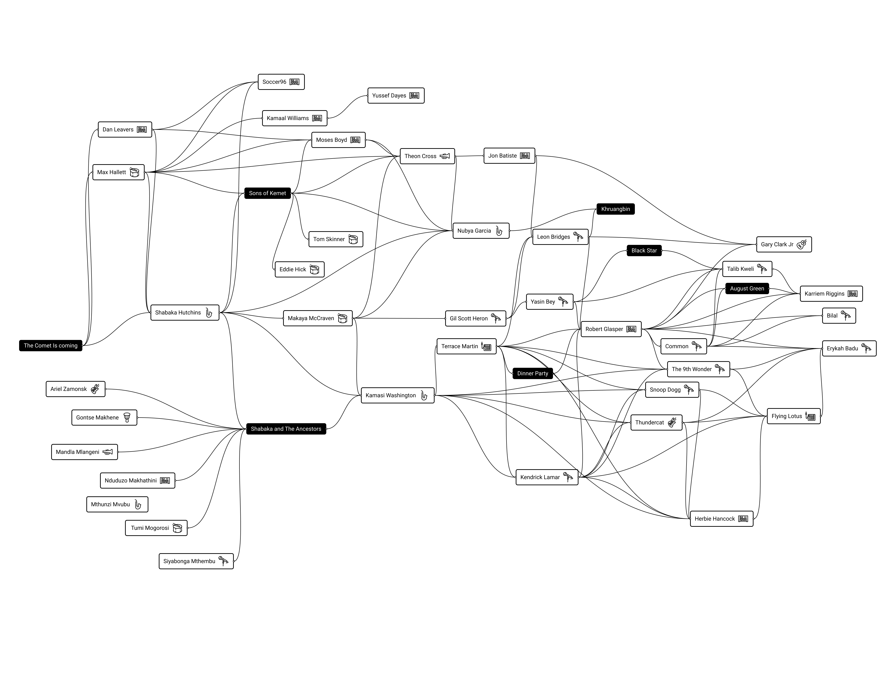 A few of the connections are bands, but most are individual musicians. For each musician an icon illustrates their primary instrument.